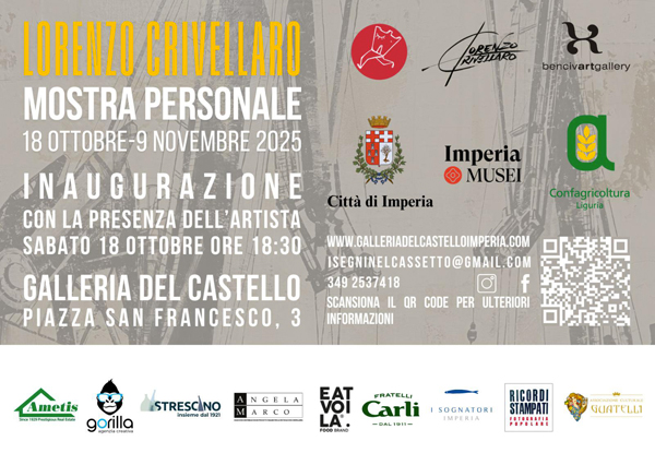 Dal 18 ottobre al 9 novembre 2025 la Galleria del Castello ospita Dreaming Imperia, la personale di Lorenzo Crivellaro, artista che trasforma la città in un teatro urbano sospeso tra sogno e realtà. Attraverso una trentina di opere e alcune serigrafie, Imperia diventa il palcoscenico di personaggi iconici come Snoopy, Mafalda, Corto Maltese e Paperino, insieme a simboli della memoria industriale locale come Carli, Sasso e Agnesi.