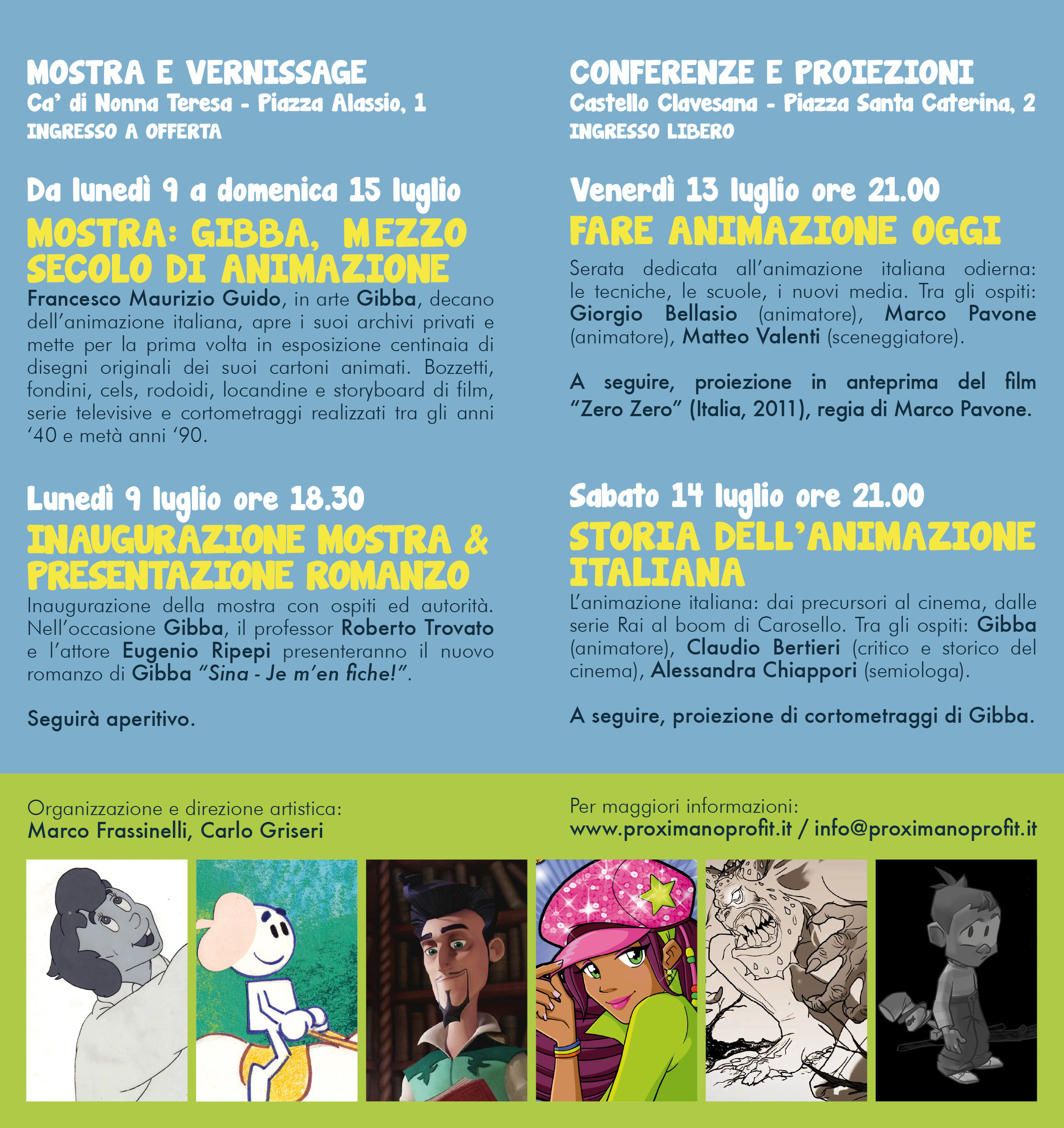 La prima serata sarà venerdì 13 luglio ore 21.00: “Fare animazione oggi: le tecniche, gli sbocchi, i nuovi media”. Interverranno Giorgio Bellasio, animatore di film quali “Donkey Xote”, “Totò Sapore e la magica storia della pizza” e “Opopomoz”, Marco Pavone, animatore dei film “Zero Zero” e “Extra 3D” oltre a molti videoclip per musicisti quali Coolio, Edoardo Bennato, Caparezza, i Subsonica, Luca Carboni, Le Vibrazioni, e Matteo Valenti, sceneggiatore di serie animate Rai quali “Il mondo di Stefi” e “Teen Days” e attualmente al lavoro su un progetto animato ispirato a “Crêuza de mä” di Fabrizio De Andrè.