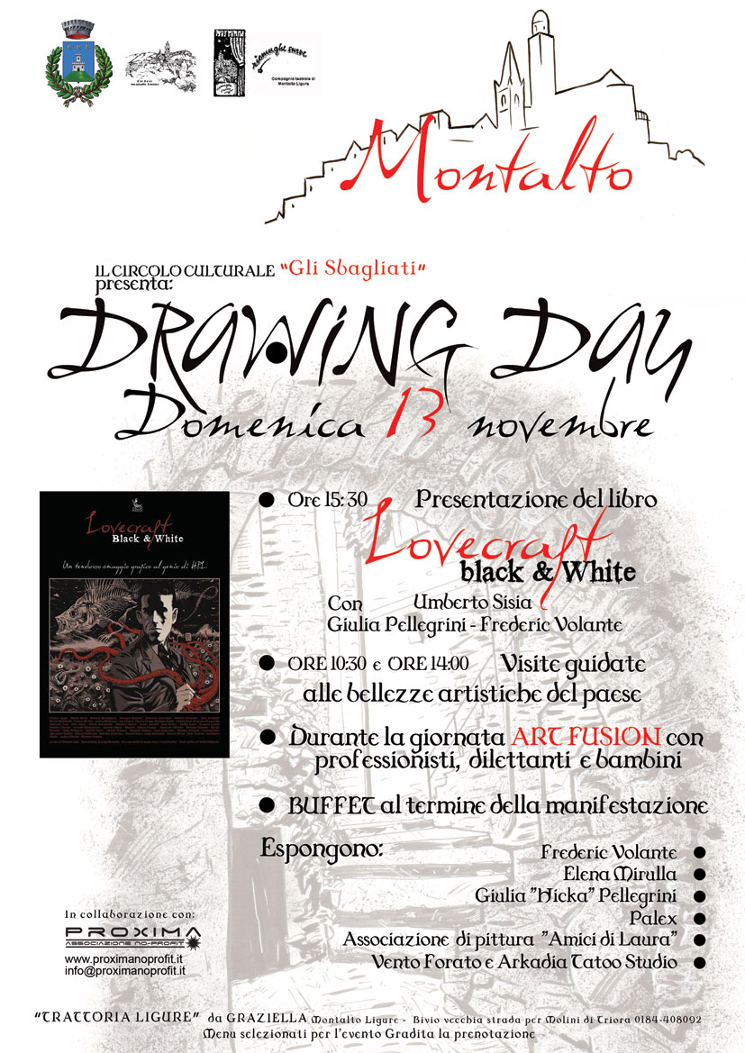 Domenica 13 novembre a Montalto Ligure (IM) si svolgerà il primo Drawing Day, evento artistico organizzato dal circolo culturale Gli sbagliati, in collaborazione con il Comune Montalto Ligure, la Pro Loco, la compagnia Riemughe surve e Proxima – Associazione no-profit. Una giornata intera dedicata al disegno in ogni sua forma, nella splendida cornice del borgo medioevale di Montalto Ligure, in provincia di Imperia lungo la strada che da Taggia porta a Molini di Triora. Durante il Drawing Day si potranno ammirare esposizioni artistiche di pittori (associazione di pittura Amici di Laura), tatuatori (Vento Forato, Arkadia Tatoo Studio) e fumettisti di fama nazionale e internazionale. Diversi gli artisti presenti alla manifestazione che disegneranno dal vivo per il pubblico; tra questi ricordiamo Frederic Volante (Nick Raider e Magico Vento per la Sergio Bonelli Editore, Shahidas per la francese Grand Angle), Elena Mirulla (Sexy Tales, Vampire's Tears, Gothic), Giulia Pellegrini (Gabbia dorata), Palex (alias Alessandro Prevosto, vignettista ufficiale del settimanale La Riviera), Dario Splendido (DreamS, Mazzo di Carne). Alle 10.30 e alle 14.00 saranno organizzate visite guidate alla scoperta delle bellezze artistiche del paese. Alle 15.30 vi sarà, alla presenza dei curatori, la presentazione del libro “Lovecraft B&W” dedicato al celebre scrittore fantastico H. P. Lovecraft e arricchito da illustrazioni di alcuni dei più importanti disegnatori d’Italia. Al termine della manifestazione si festeggia con un buffet.